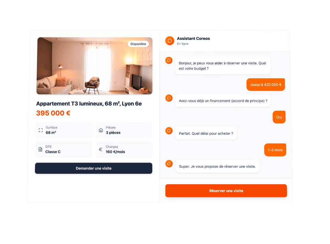 Oubliez les chatbots des années 2010. Coreos n'est pas un bot de support qui dit "Je ne comprends pas". C'est un ISA (Inside Sales Agent) Digital formé spécifiquement sur les scripts de vente immobiliers. Il pose les questions tactiques (Budget, Apport, Urgence) avec la politesse d'un assistant de direction. Vos clients seront bluffés par la réactivité, pas gênés par la machine.
